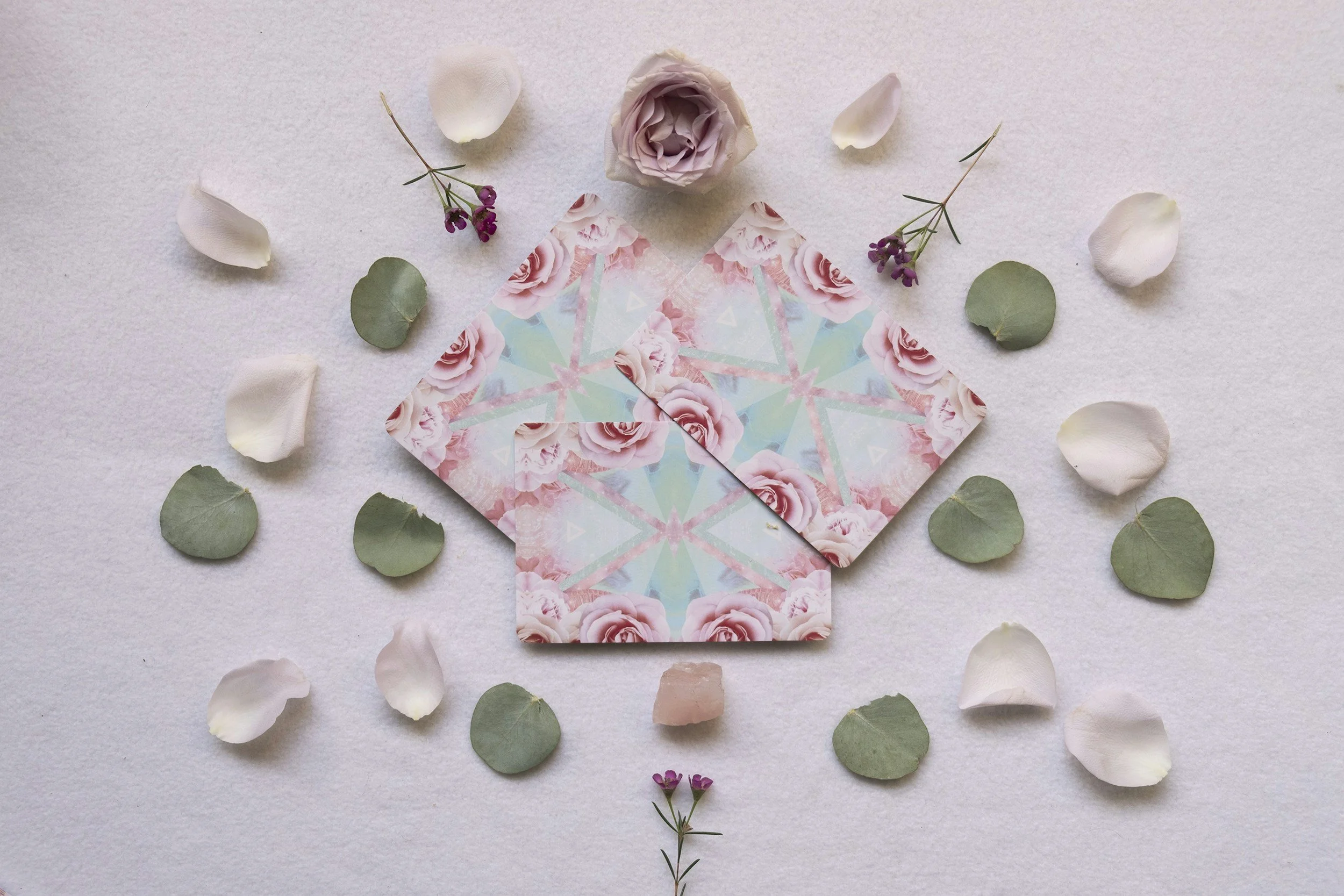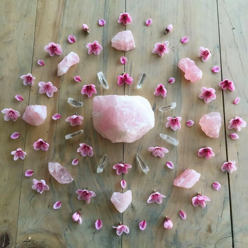 We begin by cleansing your aura with sacred smoke or a mist of Florida Water — a gentle clearing to release the day and soften your energy as you arrive. You’re warmly invited to pour yourself a cup of herbal tea, draw an oracle card, and anoint yourself with essential oils at the candlelit crystal rose mandala altar.